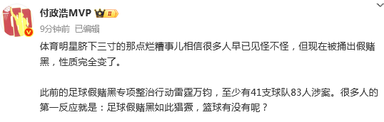 不久前,媒体人付政浩发文点评:体育明星脐下三寸的那点烂糟事儿相信很多人早已见怪不怪,但现在被捅出假赌黑,性质完全变了。